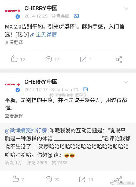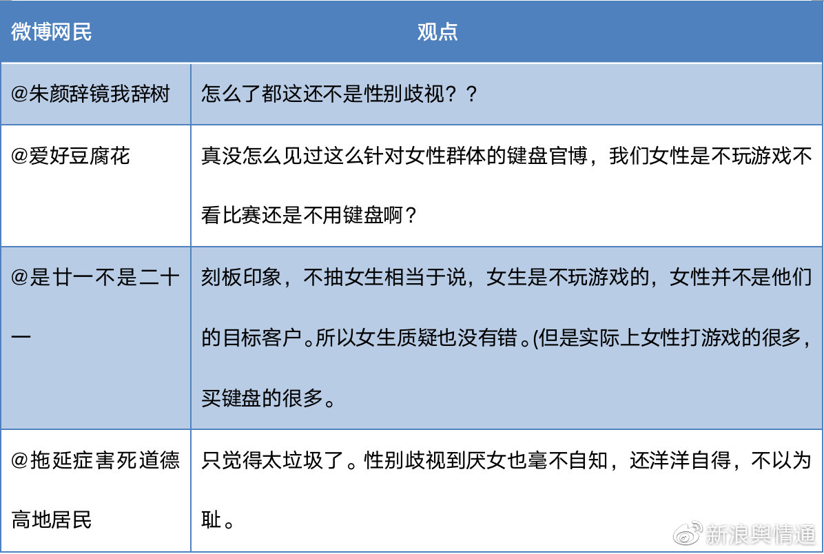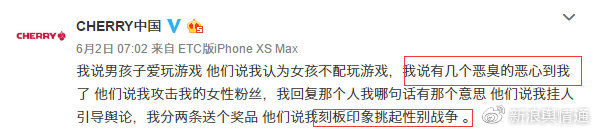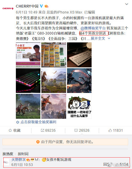 @CHERRY中国发起的键盘抽奖仅限“男性”,引发舆论不满,网友认为这种“只有男生玩游戏”的暗示,显然是一种性别刻板印象。同时,一些网友翻出公司以往营销微博,认为其“物化女性、歧视女性”的风格更是一以贯之。