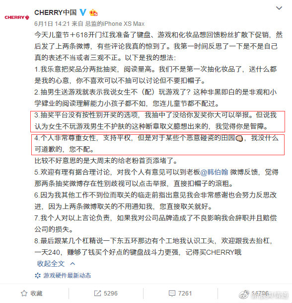6月1日10时,为了迎合六一儿童节,外设大厂CHERRY在微博发起抽奖活动,因为抽奖文案中特指了中奖用户为“男性”,一个素人妹子问的一句“女孩不配玩游戏”成为这场网络舆论大战的导火索。素人妹子的这条评论被赞了五千多次,由此网友开始质疑CHERRY歧视女性。