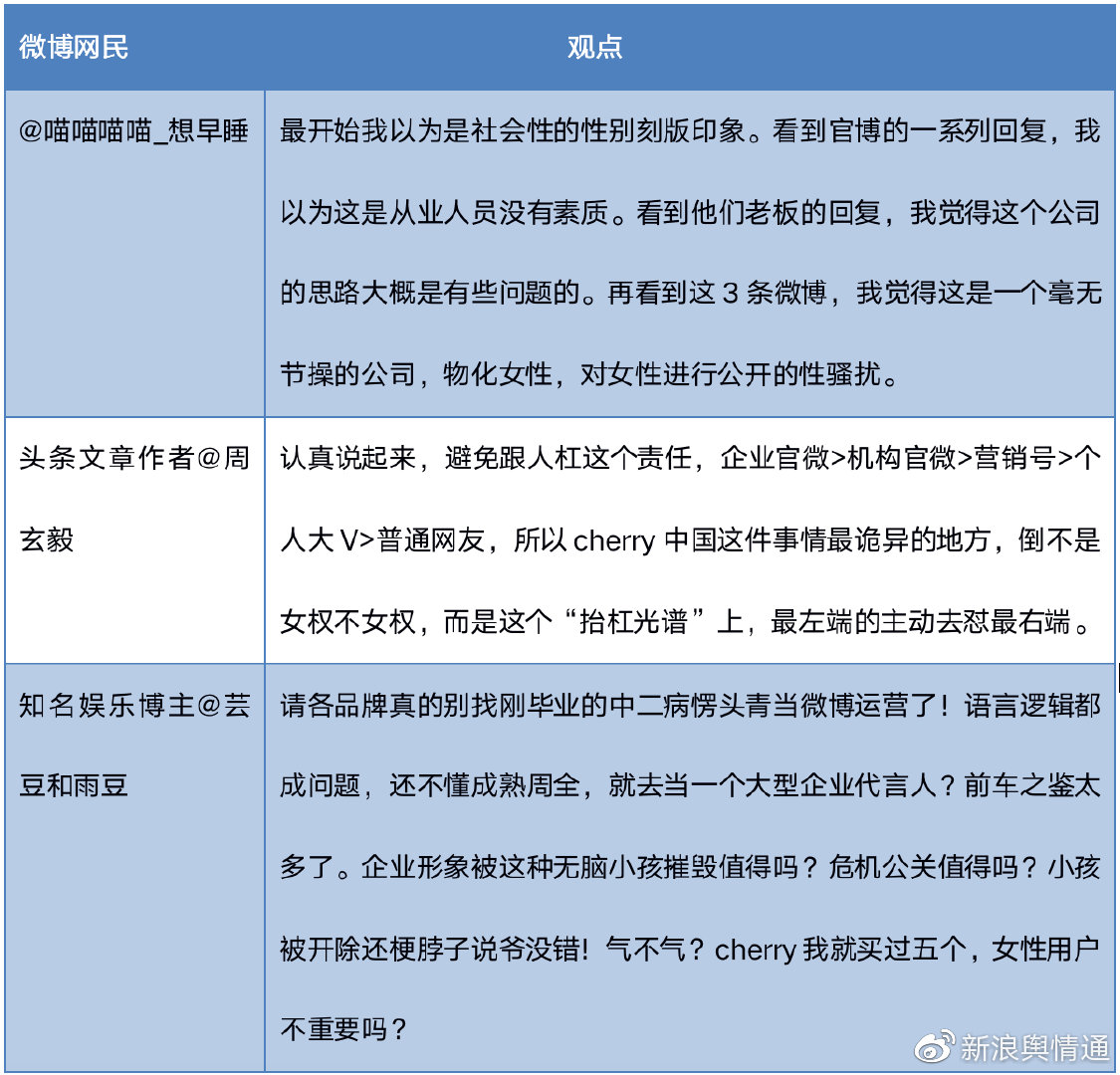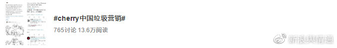 部分舆论认为@CHERRY中国 作为官博言辞不当,掀起民众仇视女权者的情绪,为博取流量而恶意营销,截至6月3日,微博话题#CHERRY中国垃圾营销#已经达到了13.6万的阅读量,引发了765次的讨论。
