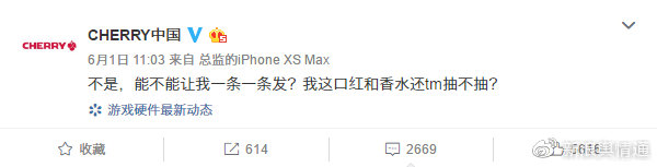 6月1日11点03分,CHERRY官博发博“我给妹子们的口红和香水还抽不抽了?”