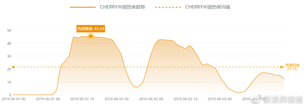 据新浪舆情通数据统计,在6月1日至6月3日期间,“CHERRY事件”全网相关信息量51万条。截至3日,#CHERRY中国性别歧视#等相关话题,总阅读量为556万次,讨论为7千条。全网热度指数趋势图上看,“CHERRY中国”3日内热度指数均值为21.25,峰值为45.54,经分析,热度峰值出现在6月1日16时,@CHERRY中国 连续发布多条微博反击“田园女权者”,引发大量网民转发讨论,是声量高涨的主要原因。
