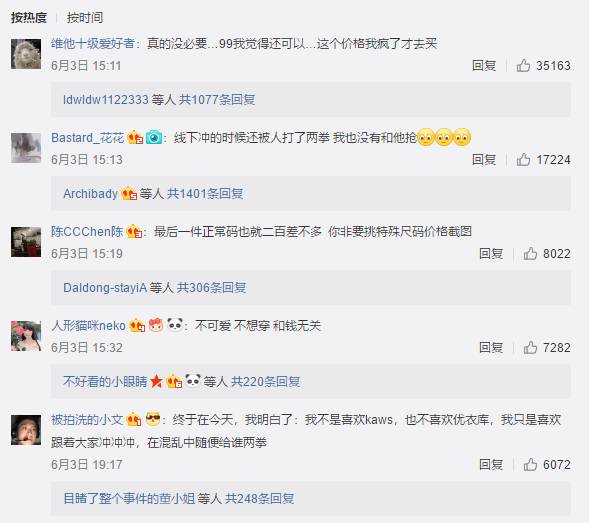 知名时尚博主@FashionWeek 知名搞笑幽默博主@阿粪青 知名动漫博主@腐女必关号 等不同领域的微博大V也纷纷在微博云参与了此次抢购,或是发表看法,或是将手里的联名T抽奖送给粉丝。这些大V也反映了该事件在微博的画风:吃瓜观望和转发抽奖。