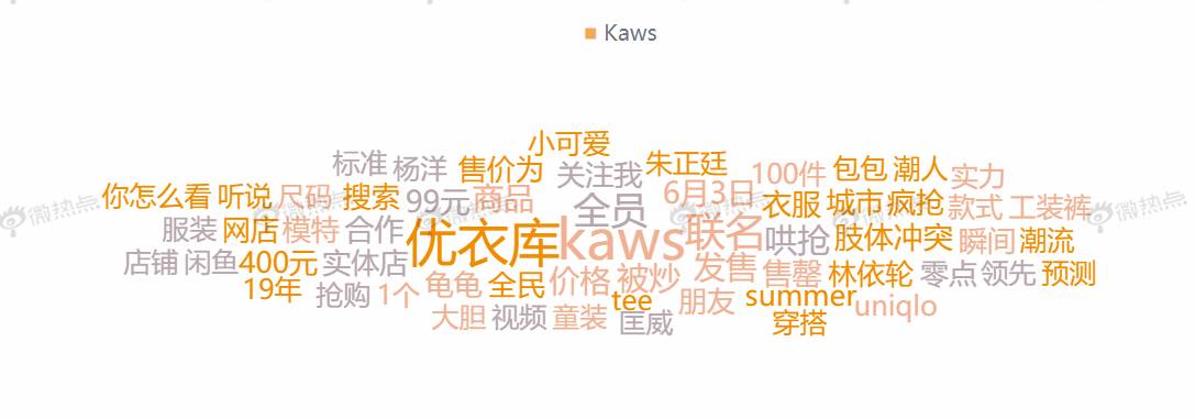 在联名款开售之前,国内外不少明星早已纷纷带货,倪妮、林允、刘涛、欧阳娜娜、朱正廷、杨洋更是早早种草。从关键词云来看,除“优衣库”“Kaws”“联名”等关键词外,“杨洋”“林依轮”“朱正廷”等明星也成为事件传播的关键词,可见明星效应下该系列获得了高度关注。