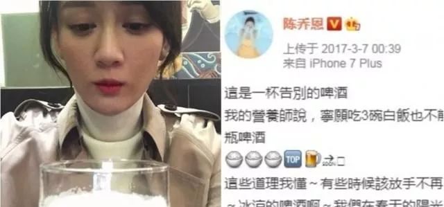 又有爆料称陈乔恩去年3月才在微博上发文透露,营养师提醒她宁愿吃3碗白饭也不能喝1瓶啤酒,并感概地写下「这是一杯告别的啤酒」,结果戒酒不到1年,又因为酒驾上头条。