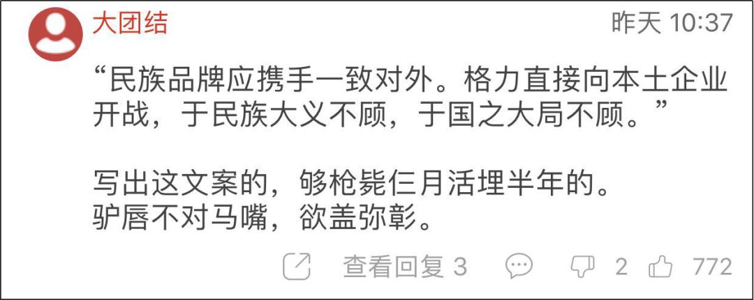 3、国家层面,将事件上升到“爱国”的高度上。拿中美贸易说事,高举民族主义大旗, 反怼格力“不顾民族大义”。