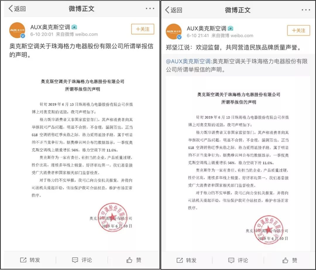 回顾奥克斯之前的举动,从第一波回应说格力恶意诋毁,并宣称报案起诉;第二阶段,发起全员转发“我是受害者”,把自己塑造成受害者的形象;到第三波,又拿民族大义证明“爱国”。