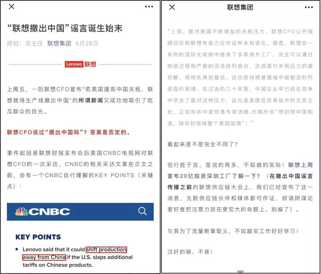 联想官方在危机回应时玩起文字游戏,表示CNBC断章取义,接着暗指大V盲目蹭流量。将矛头指向纯属媒体在“盲目狂欢”,还搬出“20亿投资深圳工厂”的计划辟谣,来证明自己真的“爱国”,而不是想“撤出中国”。