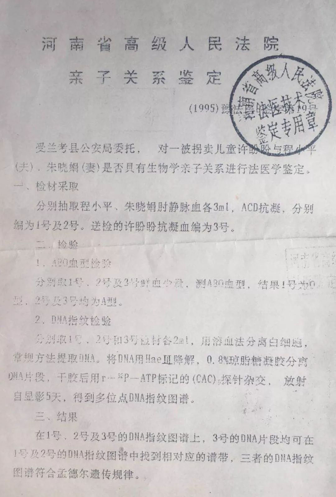 为慎重起见,夫妻俩决定做DNA鉴定,兰考县公安局遂委托河南省高院做亲子鉴定,朱晓娟夫妻缴纳了1500元鉴定费。
