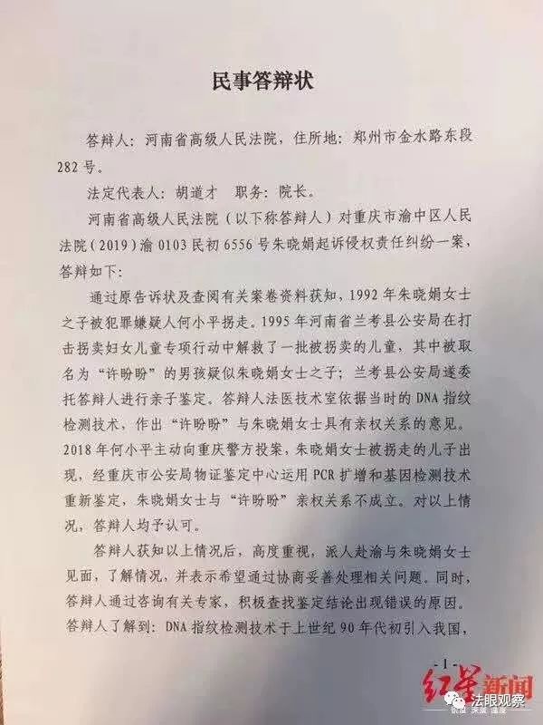 朱晓娟给记者出示了一份盖有河南高院公章的民事答辩状,上面的落款时间是5月10日。河南高院表示,他们对此高度重视,通过咨询有关专家,积极查找鉴定结论出现错误的原因。