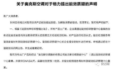 空调能耗虚高的问题,奥克斯知道不知道?知道。为什么知道还不当一回事?一则可能行业之前都如此(2013年爆出空调、家电大范围能耗造假,大牌多在其中),二则没有想到格力会发难,因此没有预案。奥克斯措手不及,这个措手不及,在第二、三回合还有体现,体现为奥克斯内部口风急变,口径不一。因为没准备,所以来回变,上下不统一。