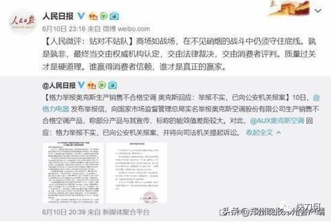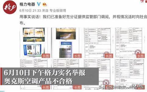 6月10日16点08分,格力微博实名举报奥克斯空调能效造假。20点01分,奥克斯立即回复,称已经报案。