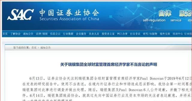 中国证券业协会发表声明,协会已将Paul Donovan列为不受欢迎人员,建议会员单位不引用其研究观点、不邀请其参与相关活动,并要求瑞银集团采取有效措施消除不良影响。