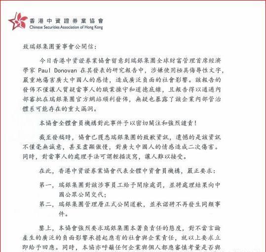 这不是多诺万个人言论的误解,这是非常严重的侮辱文字,瑞银集团对此轻描淡写,全无悔意。本协议督促瑞银集团管理层正式公开道歉,并承诺不再发生同类事件。本协会强烈要求瑞银集团对以上要求立即给予回应,否则本会将保留追究法律责任的权力。