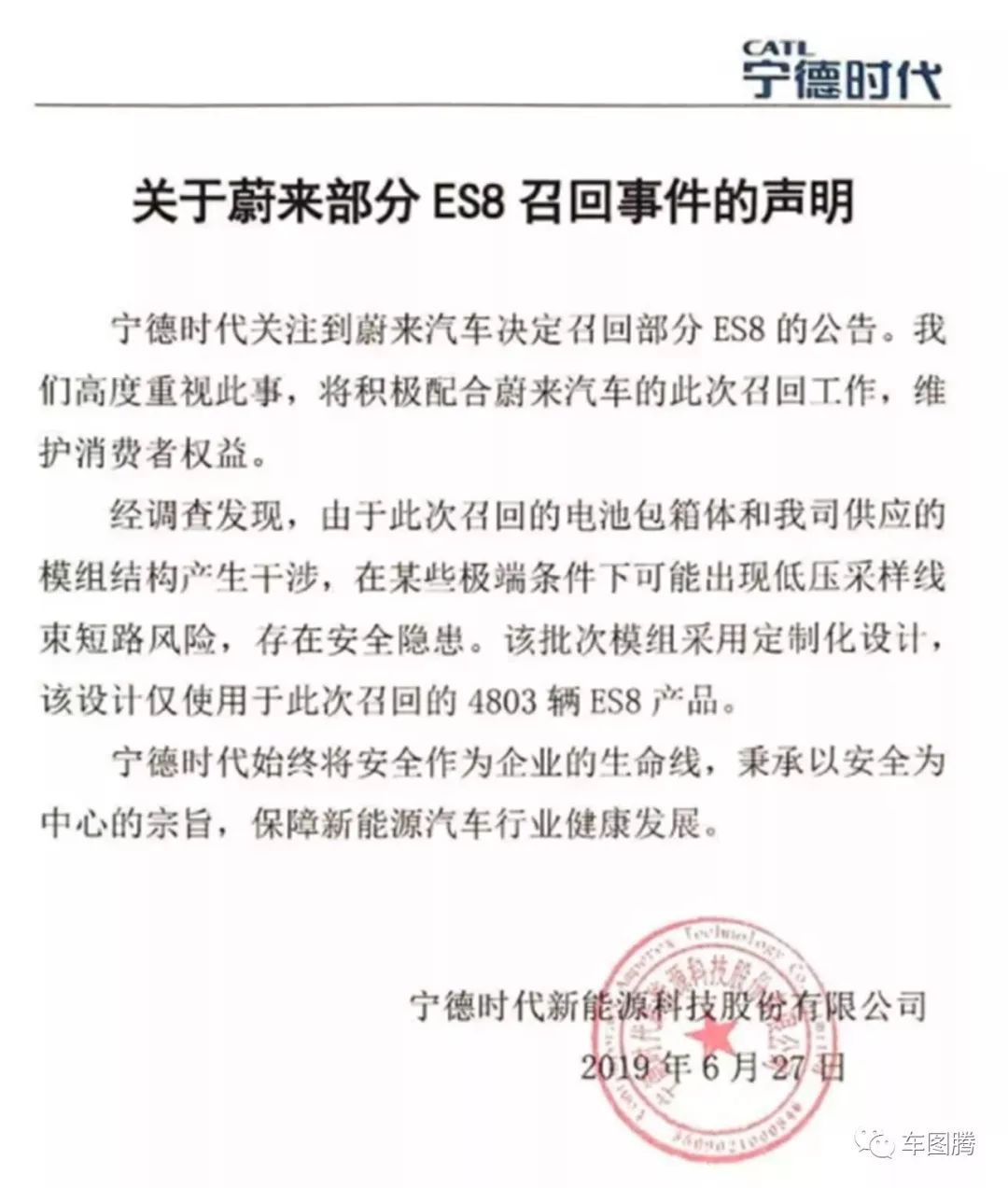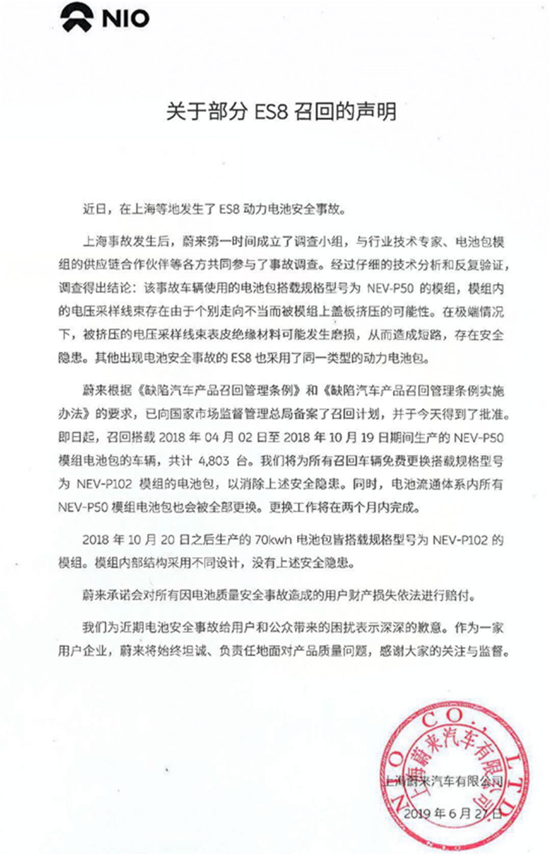 6月27日,蔚来宣布召回部分搭载了2018年4月2日到2018年10月19日期间生产的动力电池包的蔚来ES8电动汽车,共计4803辆。