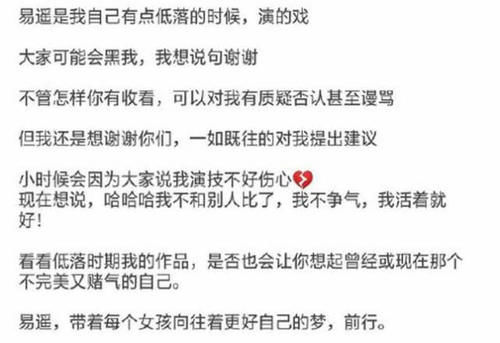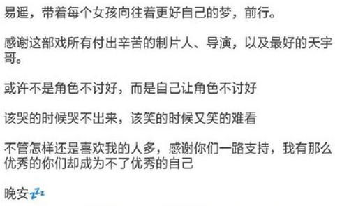 于是当日下午,郑爽就写了一篇长文来回应质疑。第一点,易遥是自己有点低落的时候演的戏,该哭的时候哭不出来,该笑的时候又笑得难看;