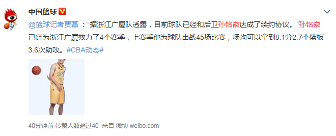 对于经历了成绩大幅滑坡一季的广厦而言,他们今夏无疑需要进一步提升球队实力,而在寻求更好的外援之前,留住球队的国手主力自然也是首要任务。如今仅仅只过了半天时间,根据最新的消息源显示,广厦已经完成与孙铭徽的续约,双方之间已经达成续约协议。