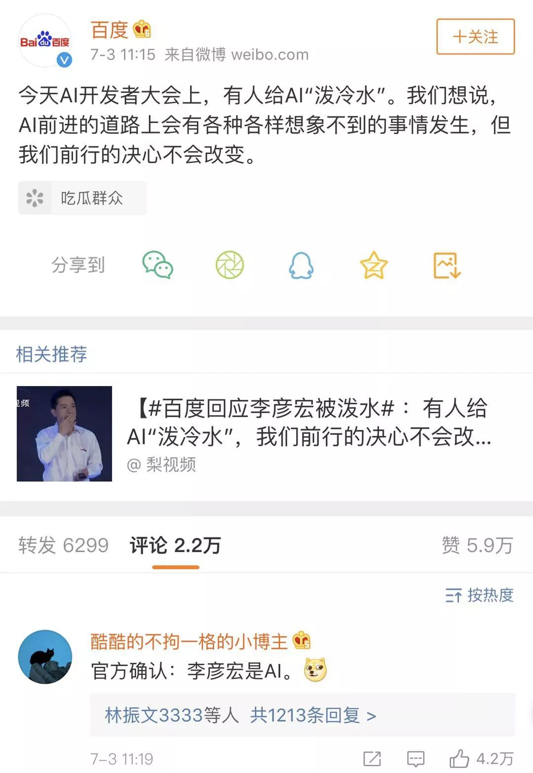 对于百度来说,这是一次失败的危机公关范例。在百度的官方声明中提到“今天AI开发者大会上,有人给AI‘泼冷水’”,并未对甚嚣尘上的“联手炒作”阴谋论给出回应,最高赞评论为“官方认证,李彦宏是AI”。目前在百度图片里,已经无法搜索李彦宏被泼水照片。