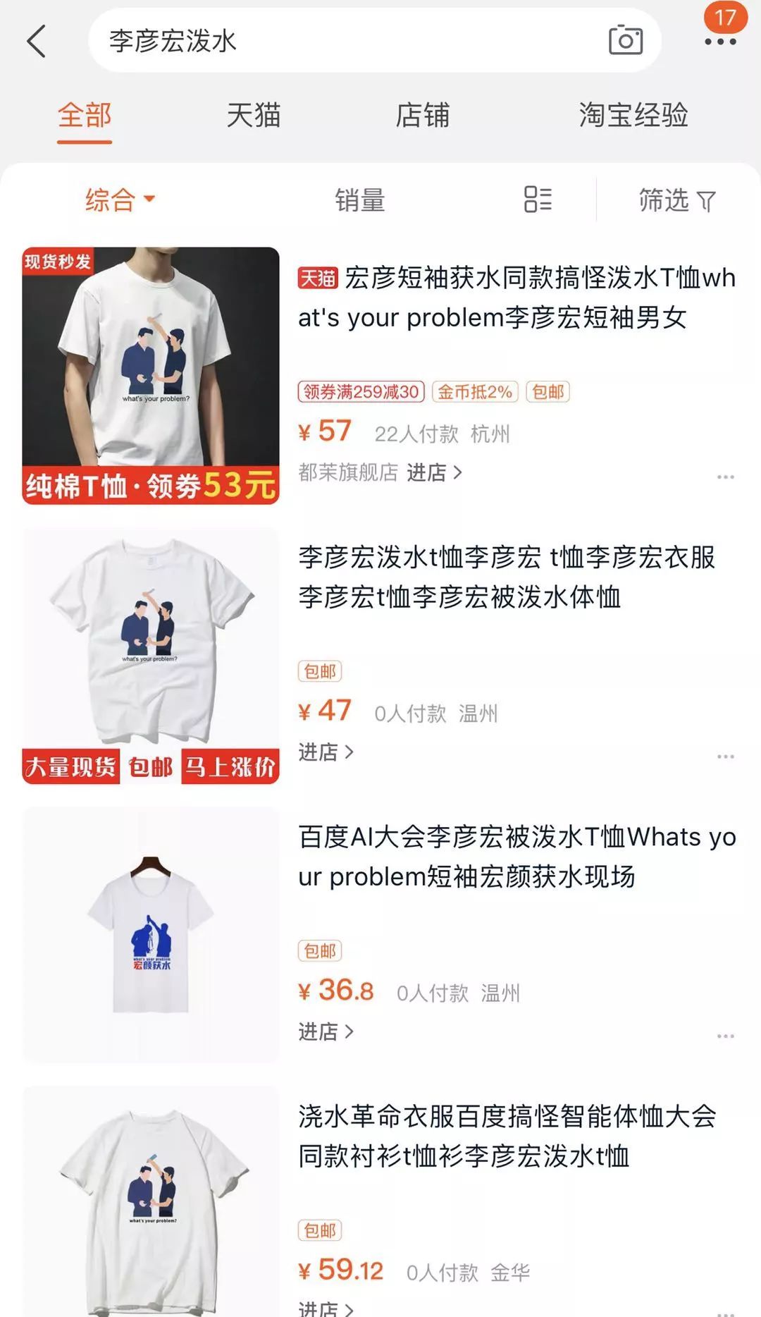 在此次刷屏热点事件中,有人嗅到了商机,淘宝上同款泼水漫画T恤于事发当日上架,电商平台趁机进行矿泉水话题营销,唯独最应该“扭危为机”的百度却没有做出更恰当的应对。