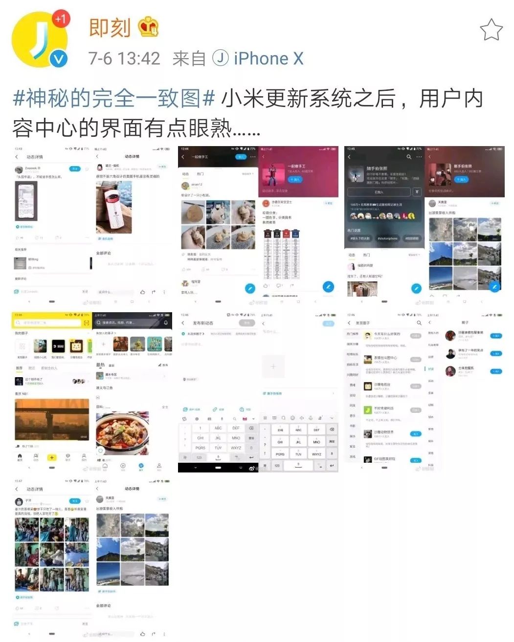 7月6日,即刻 APP 举报小米,声称小米手机在系统更新后,其用户内容中心界面和自家 APP 有过多的相似之处,并配上了7张关于相似之处的配图。小米随即作出回应。