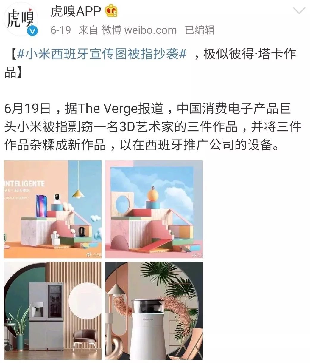 6月18日,国外设计师 Peter Tarka 通过其社交账号发文,声称小米在西班牙的宣传广告抄袭了自己多幅作品的设计元素,包括曾为 LG 设计的项目图。经报道转载,国内网友纷纷声援设计师,迫使小米作出回应。6月20日,小米发布公告承认公司员工在未经授权的情况下使用了该艺术家的作品,并当即解雇了违规员工。