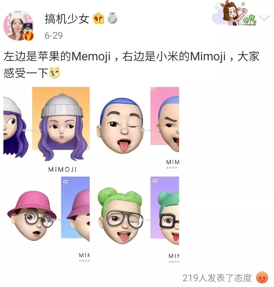 6月29日,一位微博数码博主抛出了苹果 Memoji 与小米 Mimoji 的对比图,并配文:“大家感受一下。”该微博暗指小米 CC9手机的 Mimoji 功能抄袭 iPhone 的相关形象,引发众多网友对小米的质疑和不满。