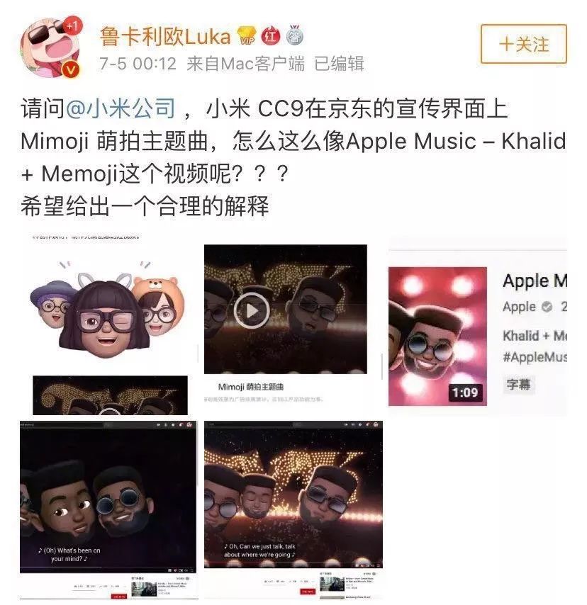 7月5日,某大 V 指出,京东商城中小米 CC9的宣传视频与 Apple Music 的某一视频广告相似度极高。对此,小米回应称,“经查的确是相关运营团队在京东平台页面上传过程中出错,上传了错误的内容。内部正在进一步调查并将严肃处理。”到目前为止,该声明发布后暂无后续。