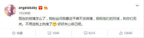 随着事态的发展,Angelababy应该自己也感受到了这几段莫名其妙的话语给大家带来的困惑,毕竟微博热搜第一这可不是谁都能上去的,在7月17日亲自发微博:现在的微博怎么了,我粉丝问我最近干嘛不发微博,我和他们的对话,和你们无关。不用送我上热搜了, 好好关心自己吧。