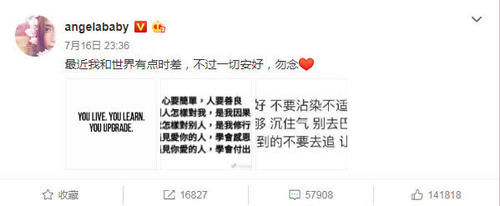 其实Angelababy发的文字倒没有什么特别之处,主要是她配发的三种图片内容不禁让人浮想联翩,第一张图片上写的是:you live, you learn, you upgrade! 可以翻译成:生活就是要不断学习、不断提升,这句话像是在告诫自己需要在人生道路上不断努力,也好像是总给别人的忠告。而第二张和第三中图片上的文字就容易让网友们想偏了,特别是“别人怎样对我,是我因果;我怎样对别人,是我修行”这一句暗指自己好像受到了他人不合理的对待。Angelababy在最后说道:得不到的不要去追,让自己生气的东西永远别搭理。
