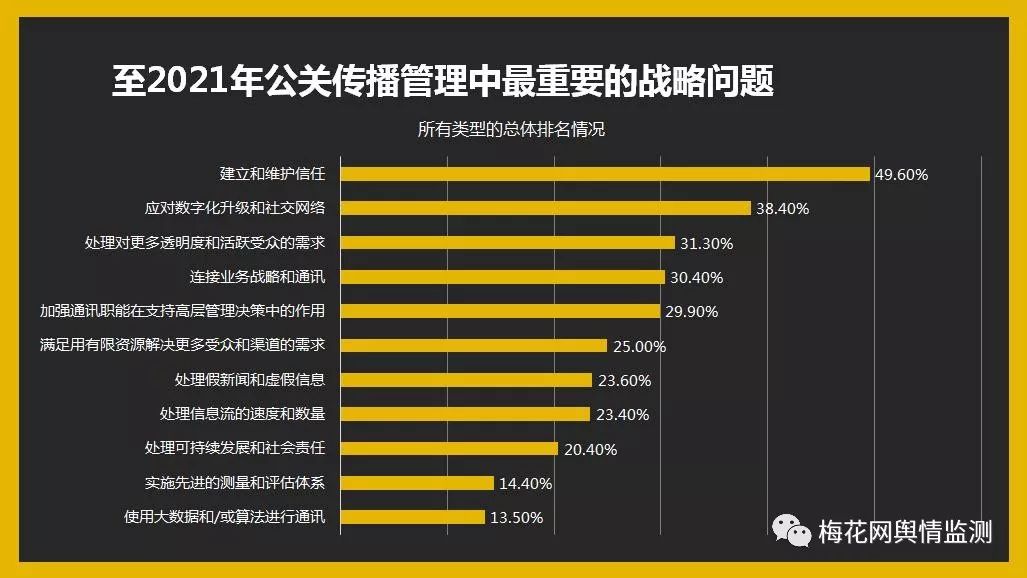 根据普朗克中心的一项针对加拿大和美国的公关状况的研究。由于虚假新闻和其他虚假信息经常渗透新闻来源,并且可能在每个(社交)角落引起声誉危机,建立和维护信任是目前公关面临的最关键问题。