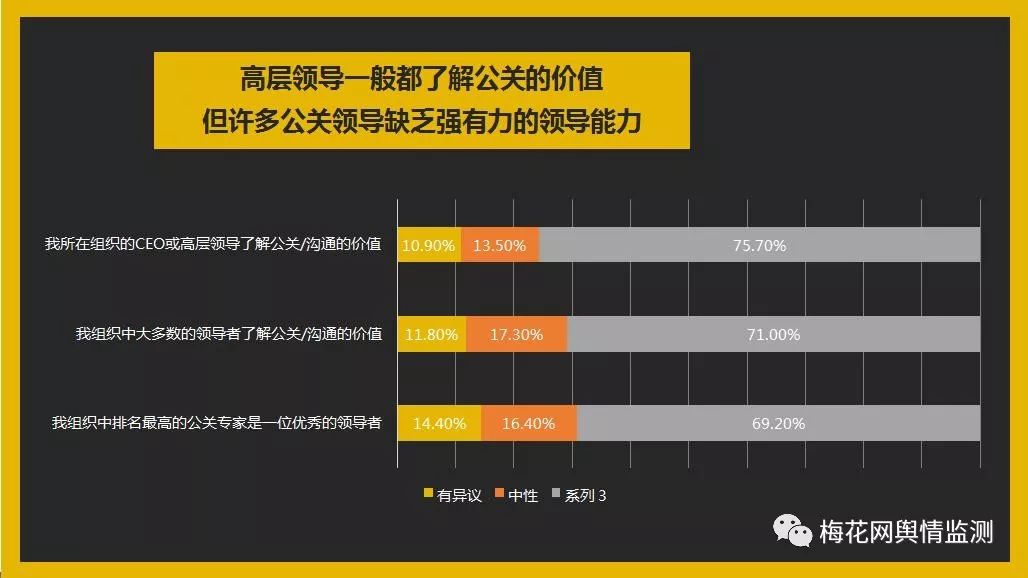该研究加入了欧洲,拉丁美洲和亚太地区现有的通信监测,探讨了各种主题,包括虚假新闻和处理它的策略、未来三年行业的首要问题、帮助做决策的信息供给、领导者的表现、专业人士的工作投入、对组织的信任度、工作满意度、工作压力、社媒技能和管理学知识。