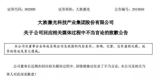 直至8月1日晚间,深交所发布公告称,已第一时间督促大族激光发布致歉公告,并对高云峰不当行为予以批评,提醒公司实际控制人、董监高应当虚心接受媒体监督。