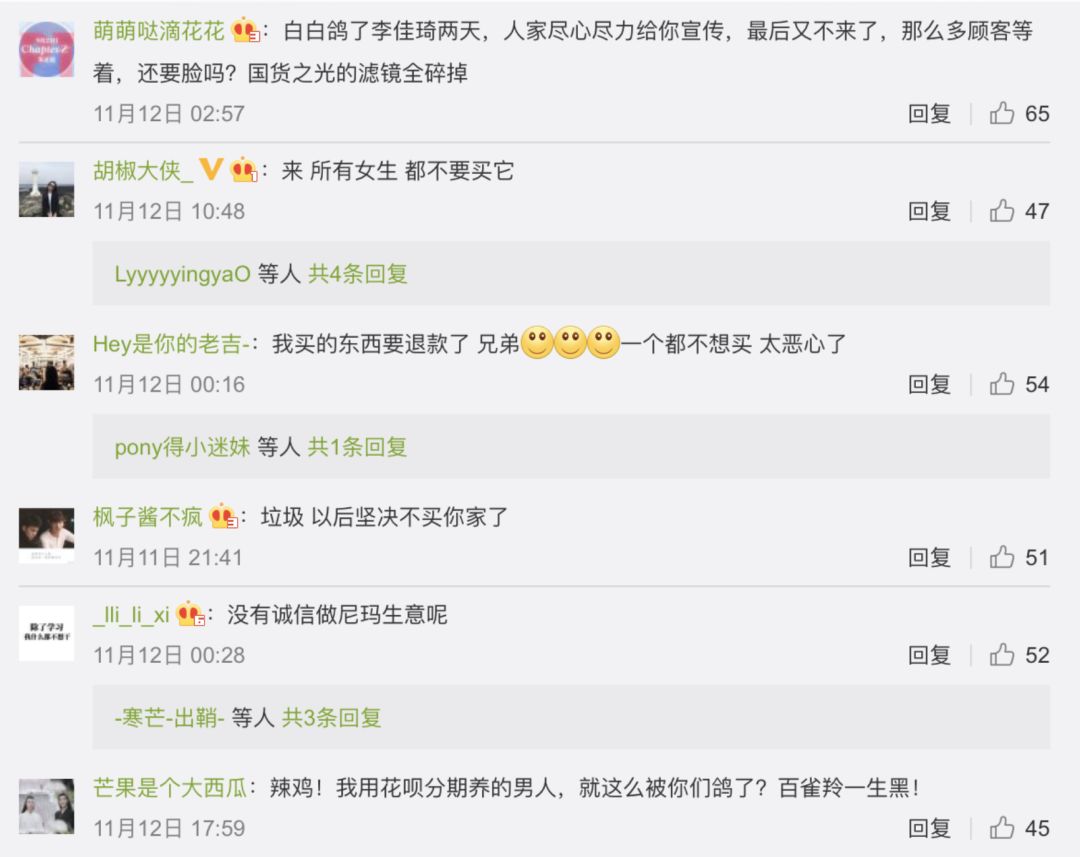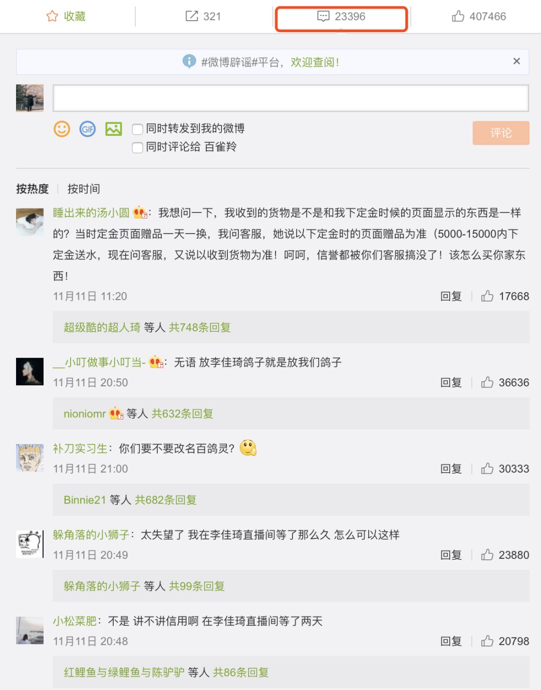 当天,“百雀羚放李佳琦鸽子”立刻登上热搜榜,相关话题阅读量高达7.4亿,百雀羚微博瞬间被攻陷,粉丝纷纷在评论下进行回击,品牌方的诚信问题遭到质疑。网友吐槽称:放人鸽子真的好吗,那么大一个品牌一点诚信都没有。