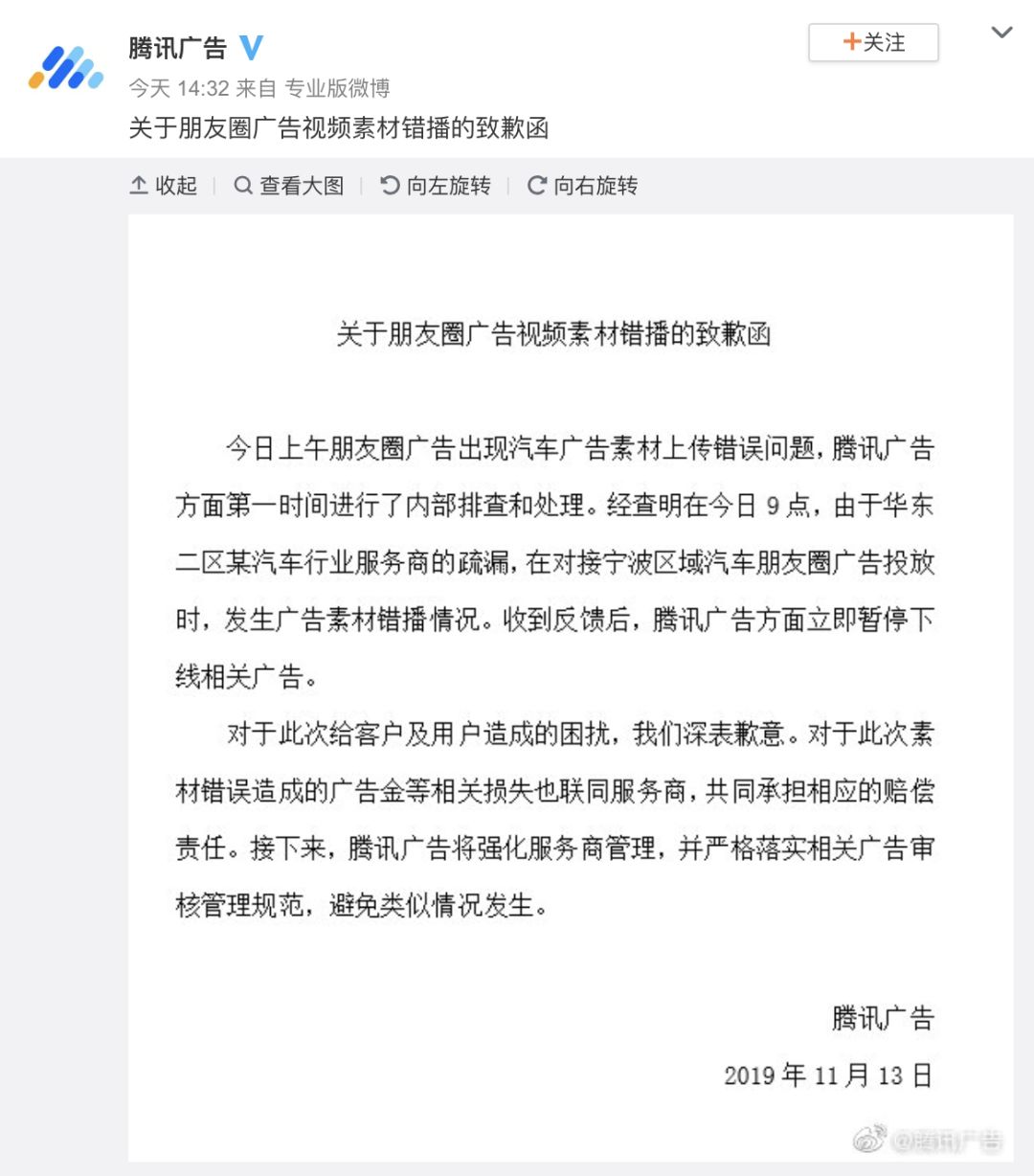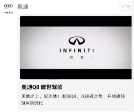 今日上午部分微信用户朋友圈广告出现汽车广告素材上传错误问题,原本奥迪的广告被上传成了英菲尼迪。对此腾讯方面及时发布致歉声明并表示承担赔偿责任,未来将落实相关广告审核规范。