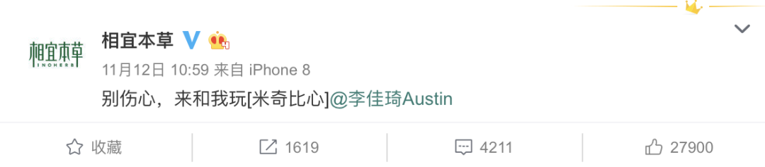作为百雀羚的老对手,相宜本草也没忘借势蹭了一波热点,官微@李佳琦并戏称:“别伤心,来和我玩。”一涨一消之间,相宜本草在消费者心中的品牌形象瞬间超过了百雀羚。