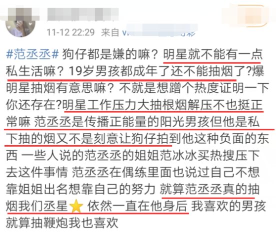 范丞丞的粉丝有理智的,但是也有很极端的,比如下面这位女粉丝。她洗白说:明星就不能有一点私生活嘛?19岁男孩都成年了还不能抽烟了?明星工作压力大抽根烟解压不也挺正常嘛?
