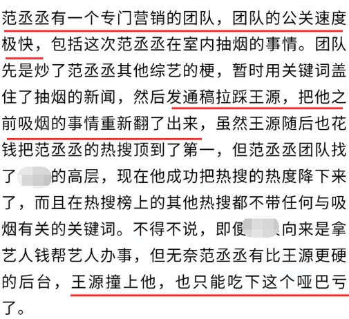 知情人士曝光了范丞丞团队公关手段,先炒作范丞丞其他综艺节目的梗,暂时用关键词覆盖了抽烟新闻,然后就发布通稿拉踩王源,把王源以前北京餐厅抽烟的事情重新挖出来。