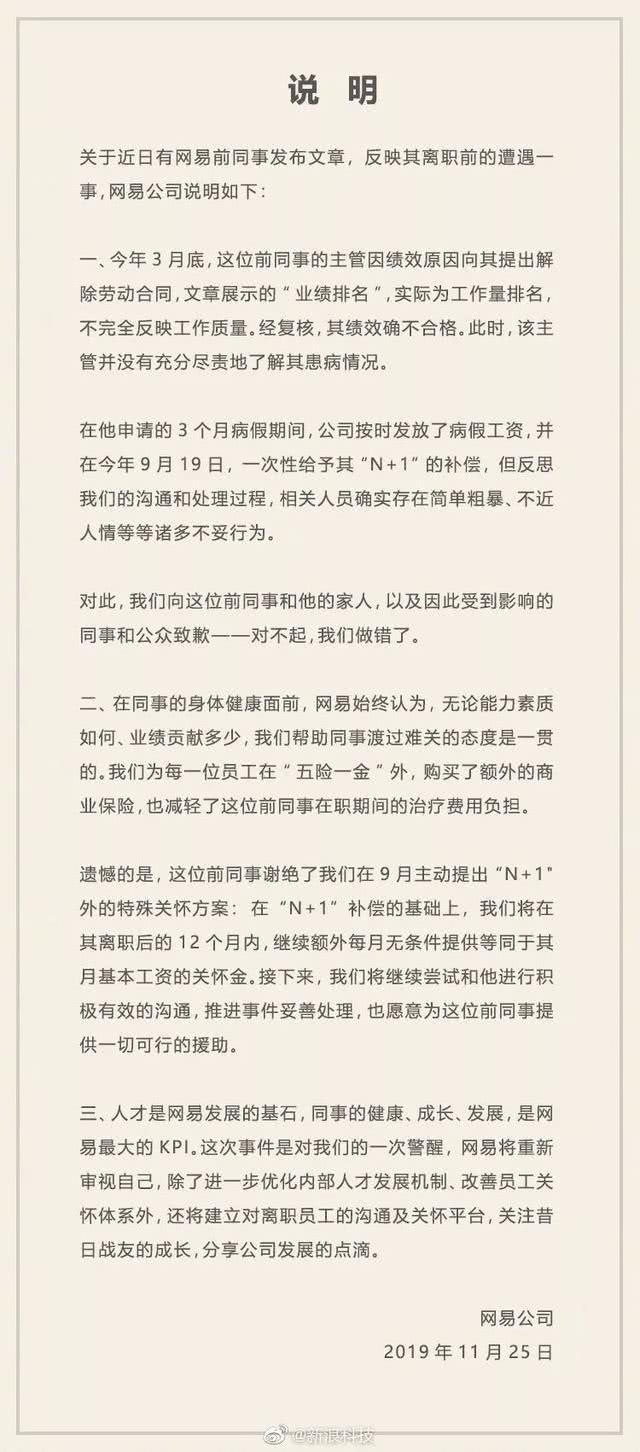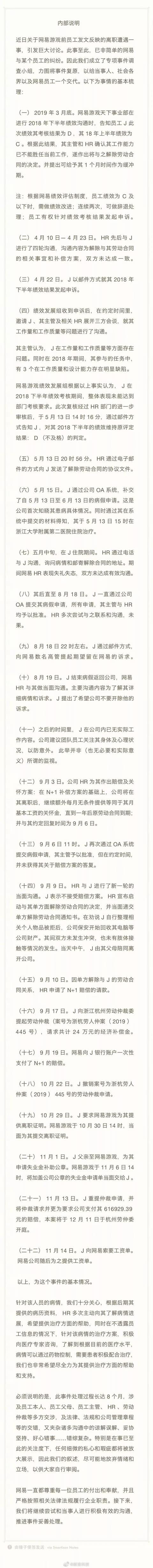 午间,,网易又再次发声,对事件的时间线进行了梳理,力证自己给了该员工应有的补偿,并声明自己的处理流程在正规合法的范围内。