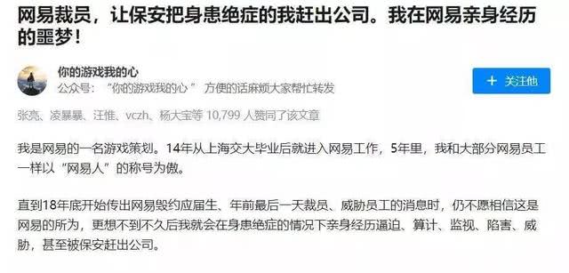 一篇名为《网易裁员,让保安把身患绝症的我赶出公司。我在网易亲身经历的噩梦》的文章先是成为知乎热帖,而后又在朋友圈刷屏,让网易成为众矢之的。