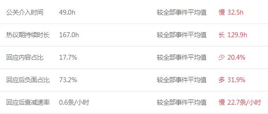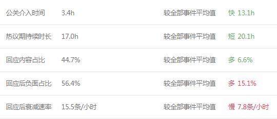 从整体公关效果来看,獐子岛集团的本次公关可以说是无一处值得称赞:49h后,公关介入,较全部事件平均值慢32.5h;热议期持续时长达167h,较全部事件平均值长129.9h;回应内容占比17.7%,较全部事件平均值少20.4%;回应后负面占比仍高达73.2%,较全部事件平均值高出31.9%。