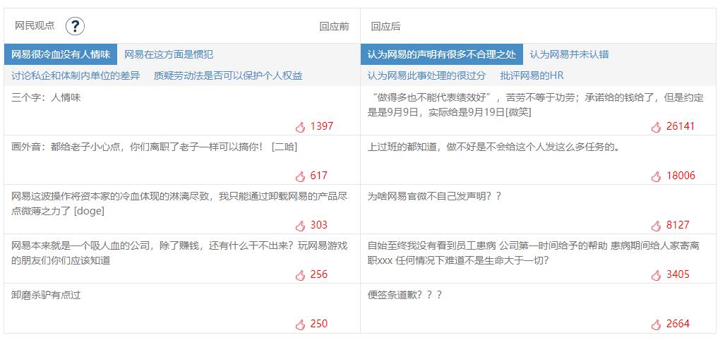 回应前,网友指责网易“冷血没有人情味”,认为网易在这方面是惯犯;回应后,不少人觉得声明中有很多不合理之处,认为网易并未认错。
