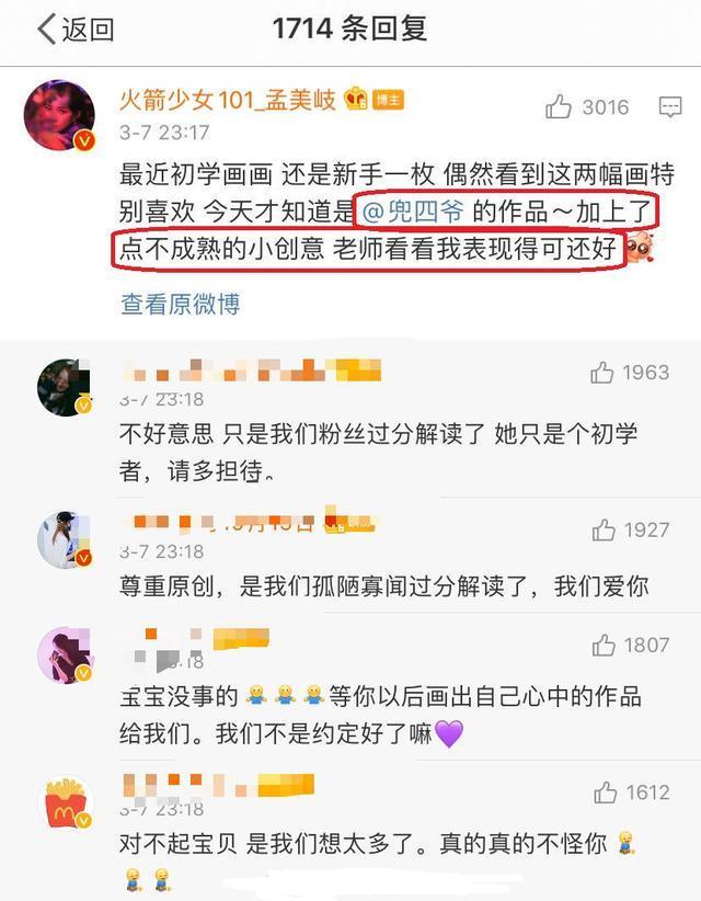 你看孟美岐的粉丝,就是老老实实地认错。 “不好意思,只是我们粉丝过分解读了,她只是个初学者,请多担待。”“尊重原创,是我们孤陋寡闻过分解读了,我们爱你!”