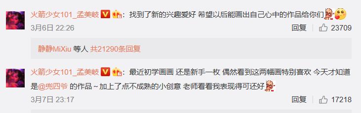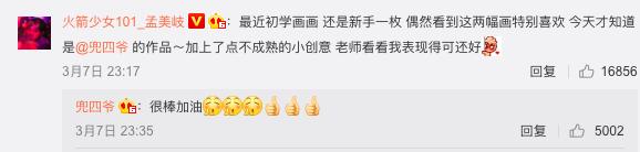 但接下来就是翻盘时刻——随后,孟美岐就在评论区回复兜四爷,她写道“最近初学画画,还是新手一枚,偶然看到这两幅画特别喜欢,今天才知道是兜四爷的作品,加上了点不成熟的小创意,老师看看我表现得可还好”。