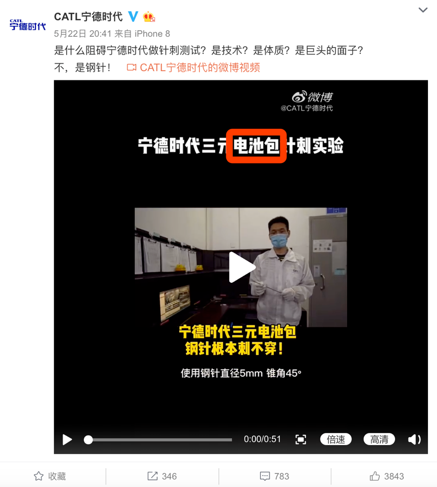 接着,宁德时代官微又先后于5月22日、5月23日发布了两条电池针刺试验的视频,告诉公众:宁德时代已经掌握了针刺试验的技术,不过没有推广而已。从表面上看,宁德时代这波危机公关除了及时性不够之外(黄金四小时法则),其他都好像做得还不错,,董事长(业内专家)发声,用事实回击质疑。但遗憾的是,这波危机公关却并没有帮其洗掉三元锂电池不安全的印象,反而收到了网友的大量质疑。