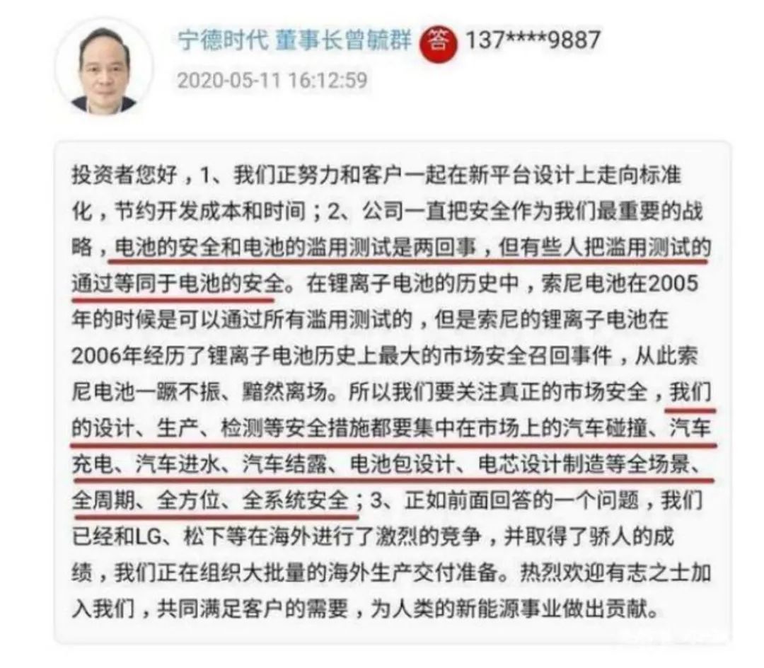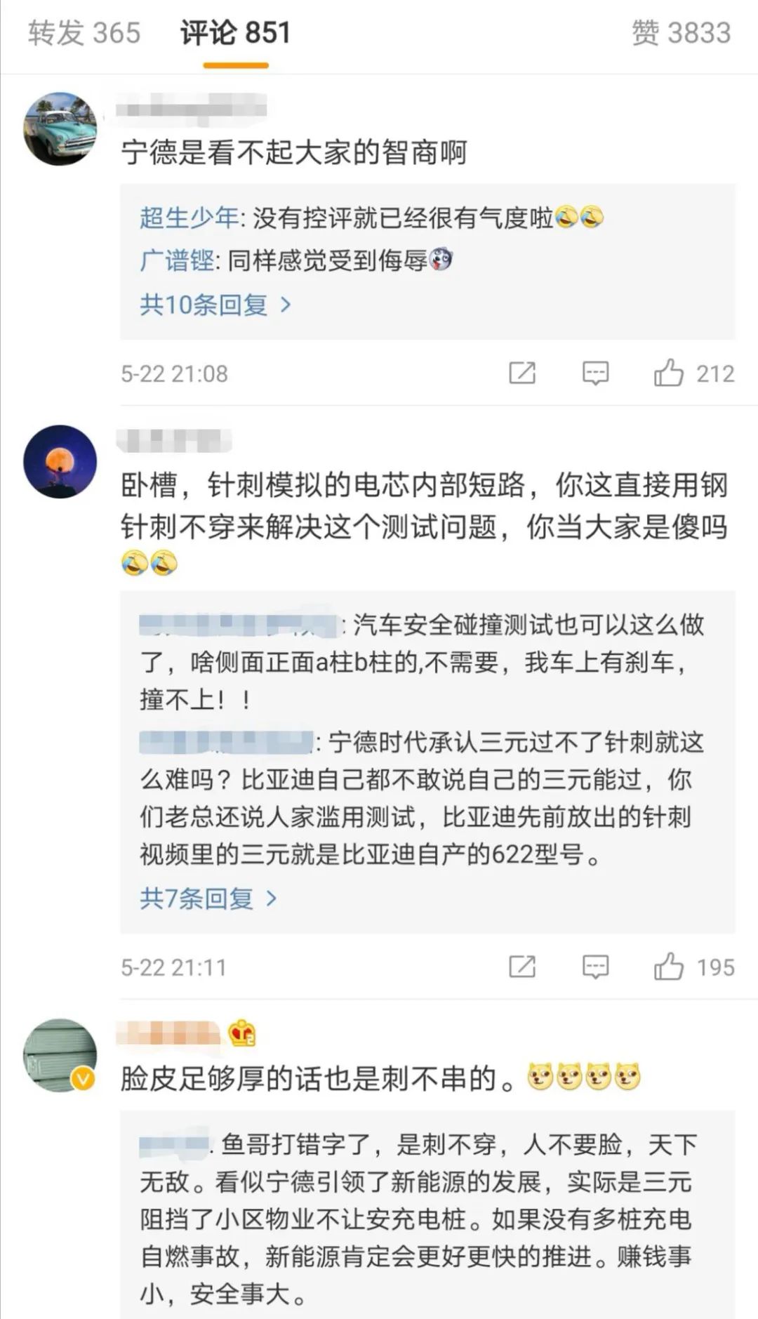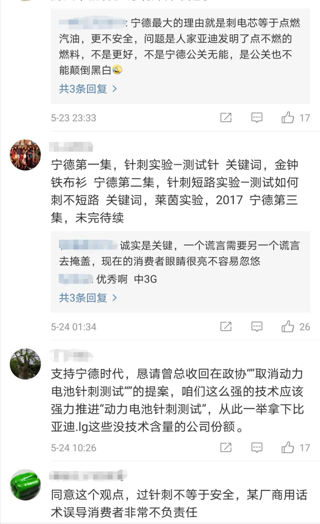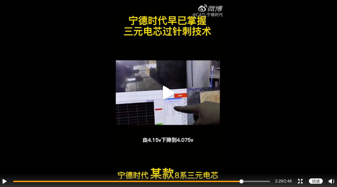 这届网友不好糊弄其实对于宁德时代来说,这次的”危机“本来完全可以避免。因为比亚迪举行针刺试验之后,公众的关注焦点其实是刀片电池,而三元锂电池和磷酸铁锂块状电池在安全性上的缺失其实早就为公众所熟知。数据显示,近几年来新能源起火的事故中,搭载三元锂电池占到了88.89%,易燃易爆的化学特性可以说是三元锂电池的原罪:其正极材料中镍元素能够提升电池的能量密度,带来更长的续航里程,但电池也更容易出现热失控,不过为了追求续航里程很多车企都刻意掩盖了这一点。作为三元锂电池的巨头,宁德时代董事长曾毓群非但不客观看待这一事实,反而把锅甩给了比亚迪,认为是比亚迪在滥用测试,误导公众。这真的是欲加之罪,何患无辞啊,跟大众汽车中国区CEO为帕萨特在中保研碰撞测试翻车开脱是一样的思维:25%偏置碰撞事故只占1%,帕萨特在其他碰撞测试中都得了高分。所谓安全大于天,安全性能的测试再严苛都不为过,曾董事长这种说法把消费者安全置于何地?接着,宁德时代副董事长潘健表示,自己公司的三元和磷酸铁锂电池都有可通过针刺测试的产品。意思就是,比亚迪的针刺试验,我们早就做过了,不过没有传播而已。为了验证公司老板的说法,5月22日晚,宁德时代在微博发布了第一条关于针刺试验的视频。并配文:是什么阻碍宁德时代做针刺测试?是技术?是体质?是巨头的面子?不,是钢针。