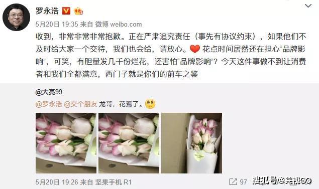 在5月15日的直播中,罗永浩卖出花点时间的鲜花,约定5月20日~5月21日可收。然而买家不是提早收到花,就是收到花后鲜花成了残花。