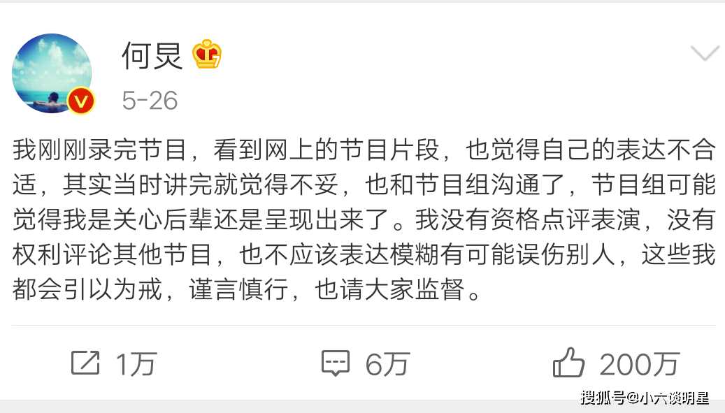 何老师在道歉中提到,自己在讲完这些话就已经觉得有些不妥,所以就去找节目组沟通了,但节目组认为自己是关心后辈,不会有什么大问题,所以就把视频呈现了。看看,在这两句话里,何老师直接就把责任推到了节目组身上,也就是说,虽然话是我说的,但是事是你们办的,所以直接就把祸水引到了节目组身上,也就是说,虽然话是我说的,但是事是你们办的,所以直接就把祸水引到了节目组的身份,毕竟不能因为这一点小事就起诉整个节目组吧,所以这件事情最后也只能不了了之,大事化小,小事化了。