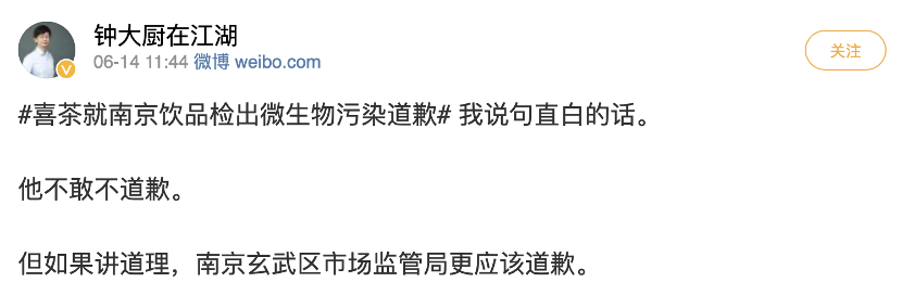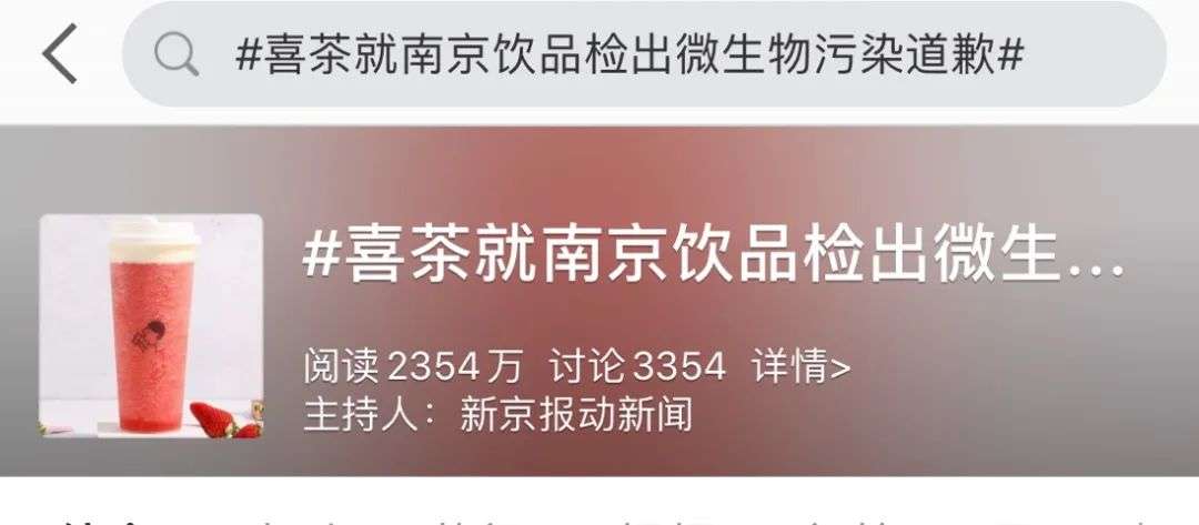 新浪微博上,#喜茶就南京饮品检出微生物污染道歉#这条Tag,阅读量超过2000万。