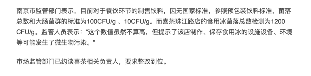 划重点:对于饮品店现场制售的原料冰块,“无国家标准”,而这次抽检采用的是“预包装饮料标准”。另外,菌落总数、大肠菌群和致病菌也不该混为一谈。即便是不适用的标准,监管人员也坦白说“数值不算高”,但喜茶还是“被约谈”了。真是当头一棒!