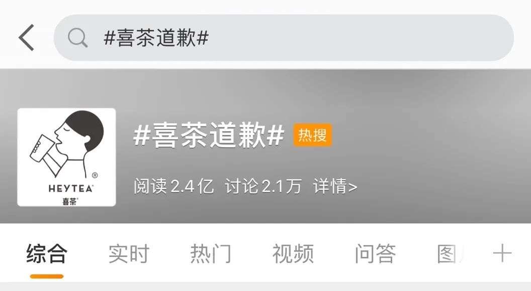 随手一搜,发现另一条高位Tag#喜茶道歉#,似乎是从杜蕾斯跨界海报事件,喜茶官微道歉上了热搜开始的。