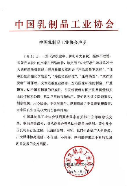 7月10日,中国乳制品工业协会(简称:中国乳品协会)通过其官方微信公号发布声明,声明针对一篇名为《深扒蒙年、伊利六大罪状,媒体不敢说,那就我来说》的文章指出:该文用“6大罪状”等极具冲击力的标题吸引眼球,恶意杜撰多家乳企“产品质量不达标”“往牛奶里添加化学物质”“降低检验标准”“压榨奶农”“欺诈消费者”等罪状,文章造谣企业摆布、左右国家标准的制定,严重损害、玷污国家标准的权威性,引发消费者对国产乳品质量和安全的怀疑和恐慌,扰乱正常的市场秩序。